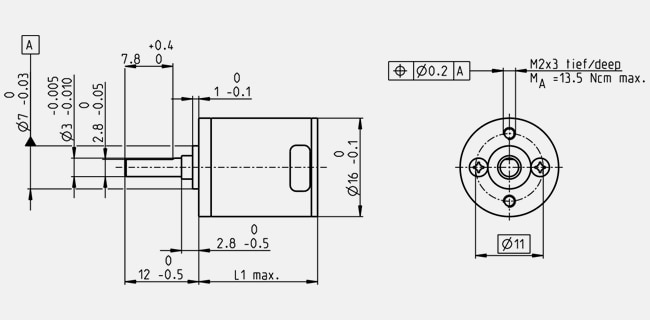 | Max. radial load | 22 N, 6.5 mm from flange |